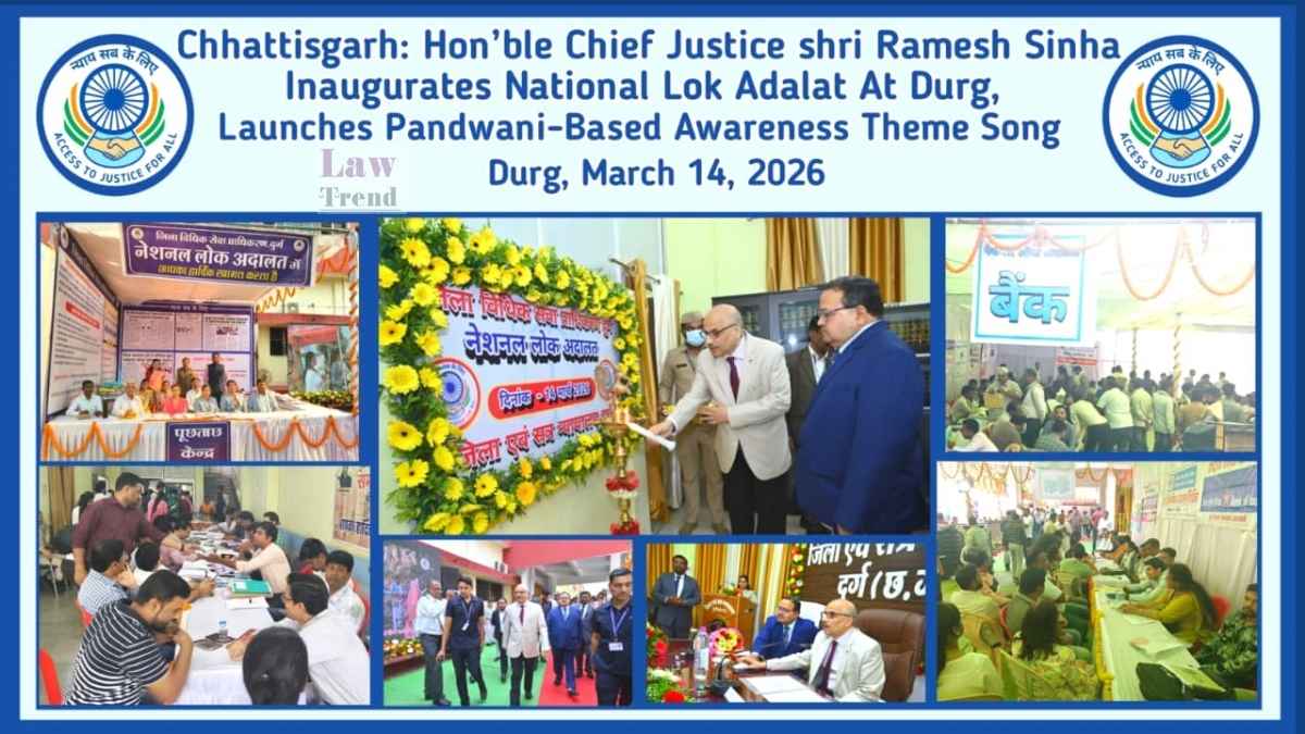 Durg, March 14, 2026: The National Lok Adalat held at the District Court premises in Durg, Chhattisgarh, was inaugurated by the Chief Justice of the High Court of Chhattisgarh and Patron in Chief SLSA, Shri Ramesh Sinha, in the presence of Naresh Kumar Chandravanshi, Portfolio Judge for District Durg. The event was organized under the aegis of the District Legal Services Authority (DLSA), Durg, in accordance with the directions issued by the National Legal Services Authority and the Chhattisgarh State Legal Services Authority.